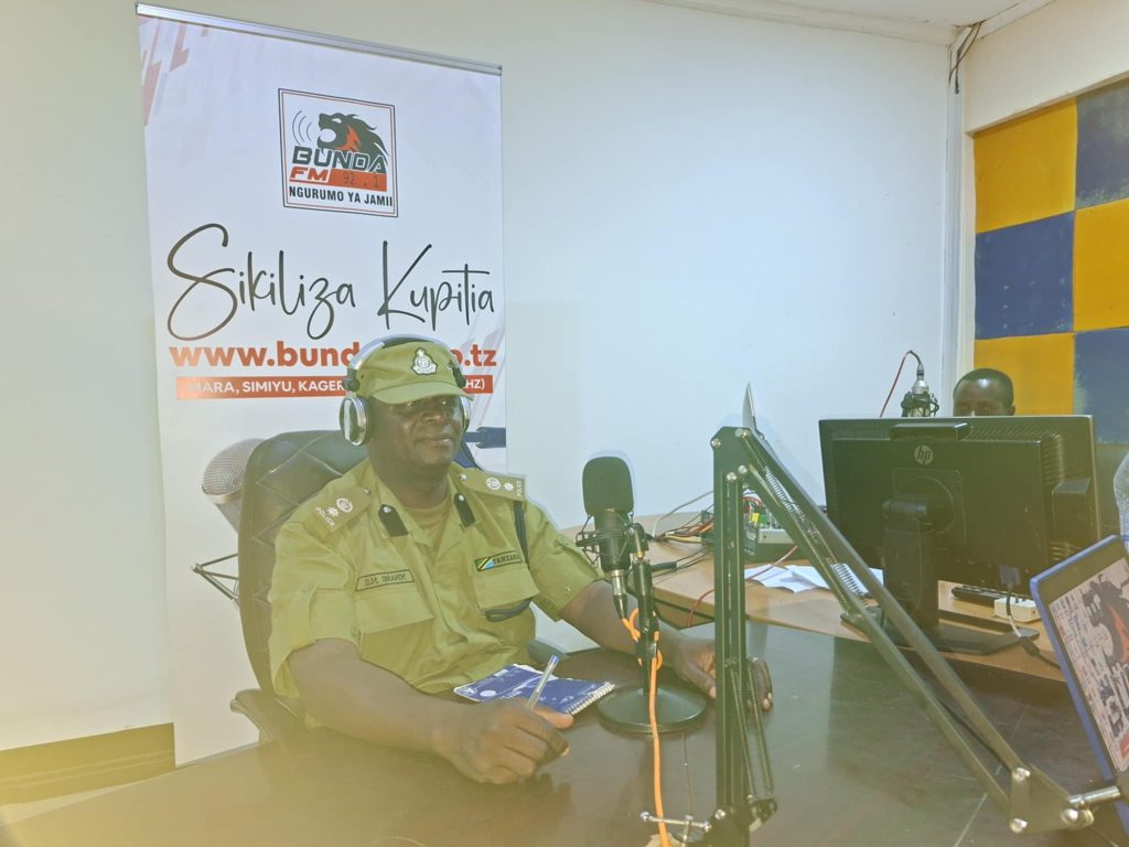 Mkuu wa polisi wilaya ya Butiama(OCD) Mrakibu mwandamizi wa jeshi la polisi Daudi Methew Ibrahim akizungumza na Bunda FM kwenye kipindi cha Busati la Habari kinachoruka Jumatatu hadi Ijumaa. Picha na Witness Joseph