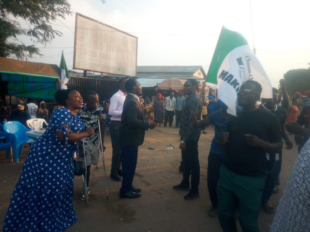 Mgombea urais Coaster Kibonde katikati akisalimiana na baadhi ya wanachama wa chama cha Makini. Picha na Samwel Mbugi